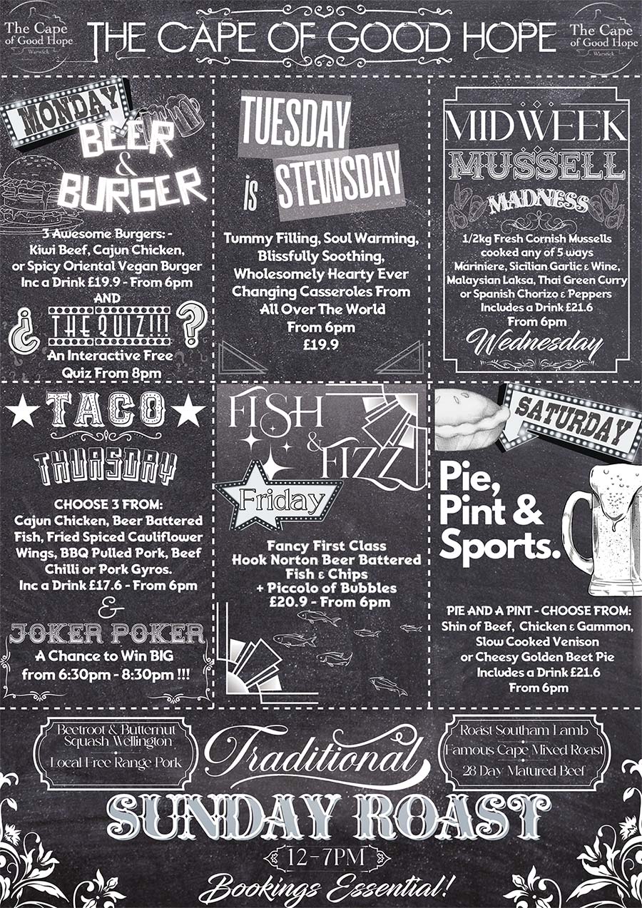 The menu at the Cape of Good Hope reflects the best of traditional British cuisine, with a focus on hearty, comforting dishes.